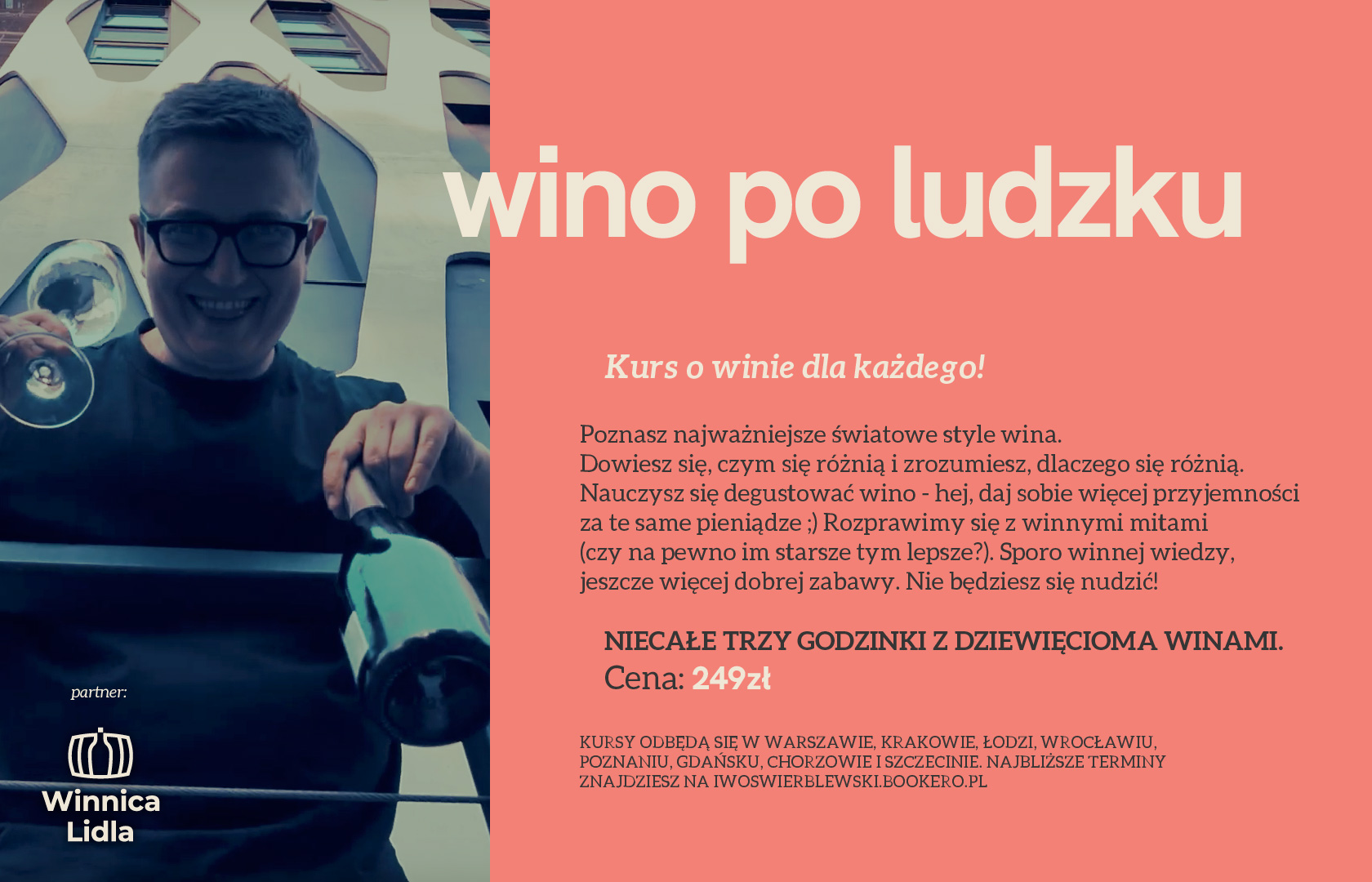 Wino po ludzku to kurs stacjonarny - przyjeżdżam do twojego miasta, a ty wpadasz w umówione miejsce i się widzimy :) Kurs trwa ok. 2,5 godziny, degustujemy 9 różnych win z Winnicy Lidla. Sporo się dowiesz o najważniejszych stylach światowego winiarstwa, winnych faktach i mitach, rozszyfrowywaniu winnej etykiety, ale przede wszystkim będziesz się świetnie bawił/a i jestem pewien, że przekonasz się, że wino jest fajne!